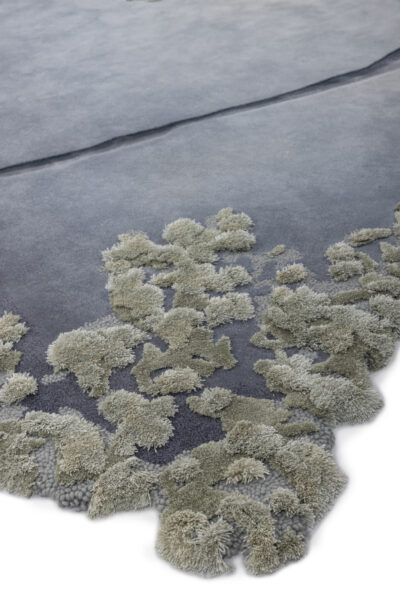 An homage to bleached coral reefs, this rug makes use of felted wool and silk to suggest aquatic vegetation on a now-broken shoreline. Pale, ivory tufts bloom out of a dynamic, inky background.