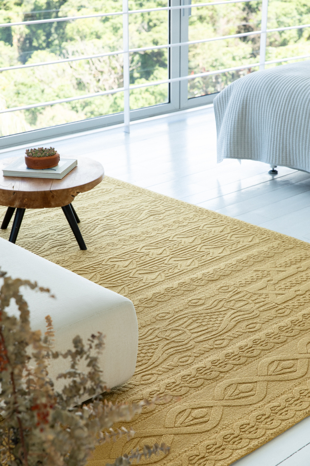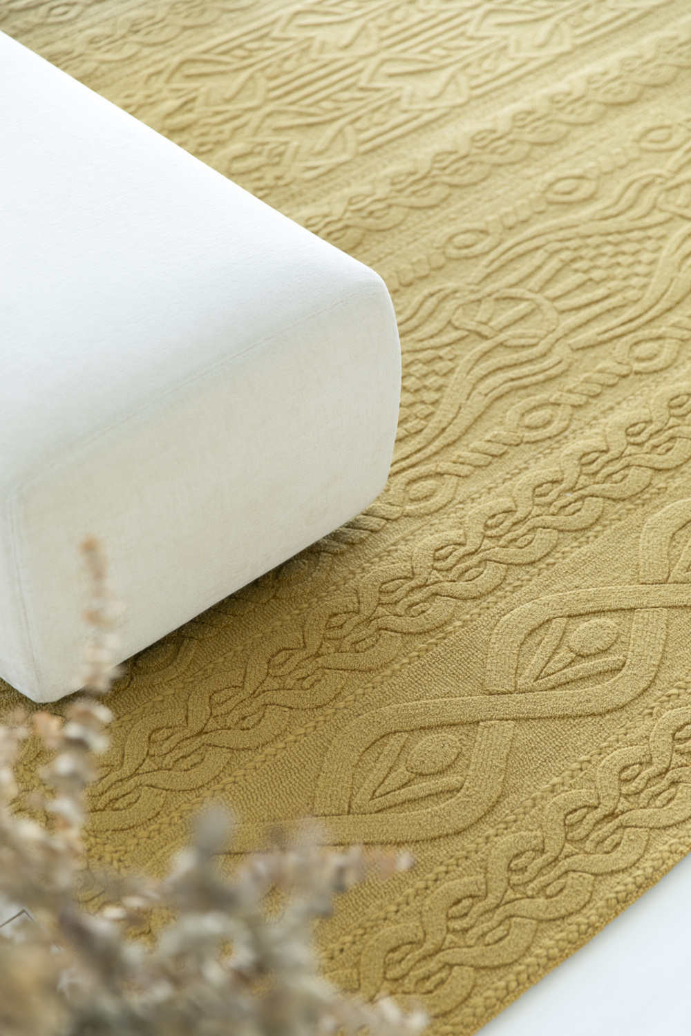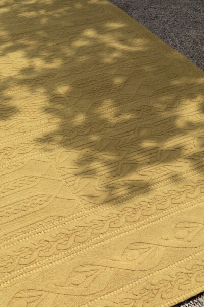Ikoi symbolising repose and restfulness, masterfully explores knitting geometry through hand-tufting and refined techniques like needlepoint and bevelling. The result is a wonderful piece radiating warmth and artistic elegance.