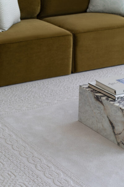 Kara is designed in a cozy beige tone and a rectangular shape, reminiscent of intricately knitted sweaters. It features unique techniques such as cut-and-loop textures and varying pile heights, creating a three-dimensional woven masterpiece for the floor.