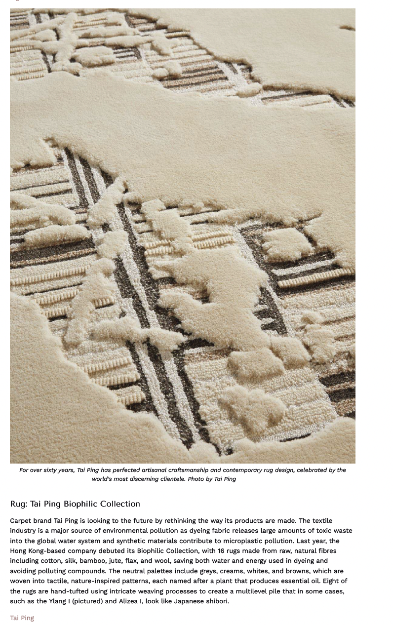In its Best of the Best selection, Robb Report highlights Tai Ping’s Biophilic Collection. Crafted from natural fibres and free from polluting dyes, the rugs combine exceptional craftsmanship, organic aesthetics, and a commitment to sustainability.