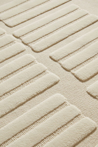 Repetition of similar yet distinct forms imbue this carpet with a sense of capricious irregularity. Sound draws inspiration from a construction technique called ‘pisé’ wherein raw materials such as straw and earth are compacted together to produce building blocks.